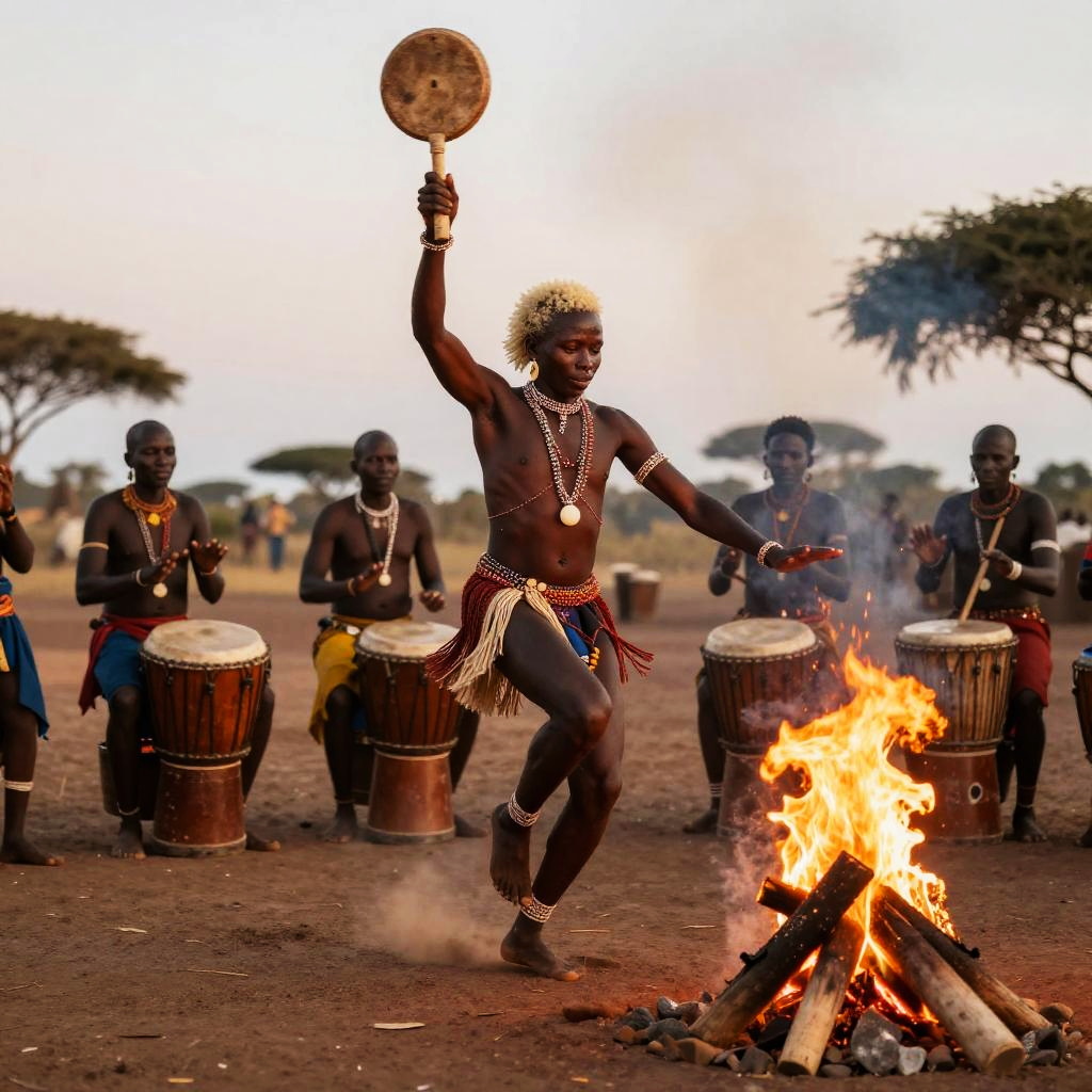 African tribe with blonde hair, dancing around a fire at dusk, traditional drums and instruments, energetic movement, smoky atmosphere, vivid earth tones, authentic tribal setting