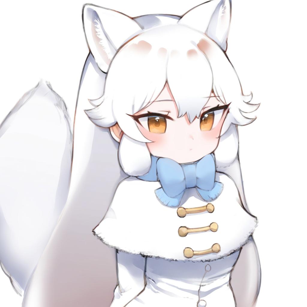 Arctic fox (kemono friends), kemono friends, 1girl, fox girl, fox ears, fox tail, extra ears, yellow eyes, hair between eyes, orange eyes, white hair, long hair, very long hair, sidelocks, white capelet, white gloves, long sleeves, blue bowtie, by artist kotatu (akaki01aoki00), leet