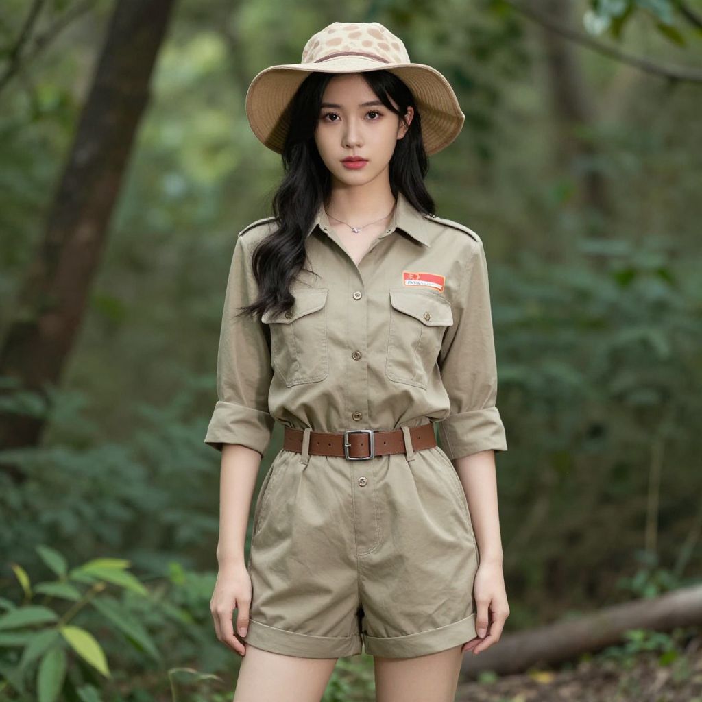 This is a photograph of an Asian woman standing in a dense, green forest. She has long, wavy black hair and wears a khaki safari outfit with a button-up shirt and high-waisted shorts, belted at the waist. She also wears a beige safari hat. Her shirt has two chest pockets and a red patch on the left side. She has fair skin and a calm expression with natural makeup. The background is blurred, highlighting the lush greenery and tree trunks. The overall style is casual and adventurous, with a natural, earthy color palette.