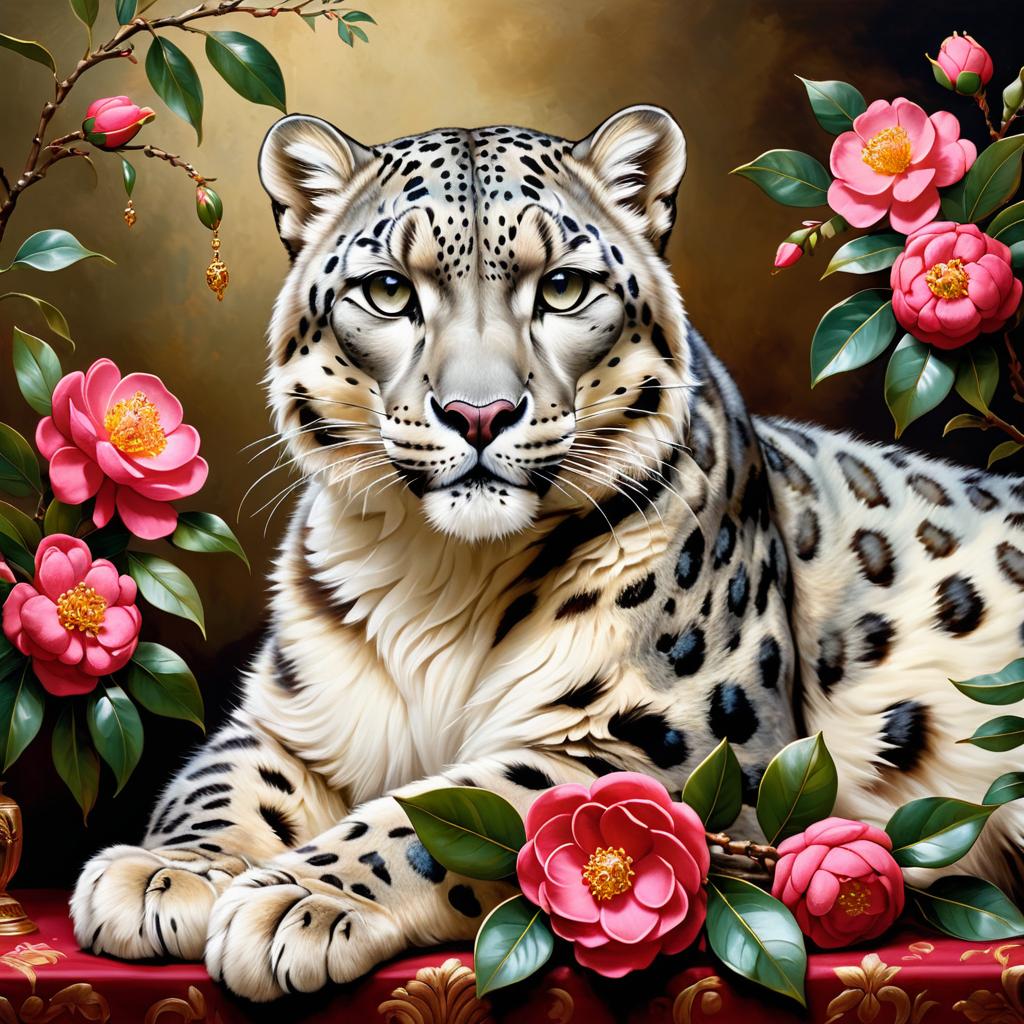 Regal Snow Leopard with Jewelry and Camellias