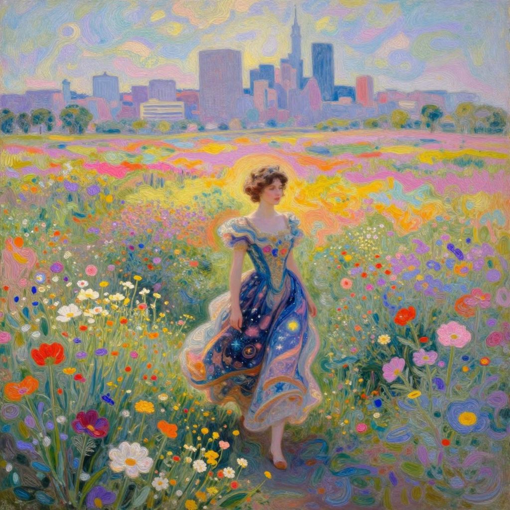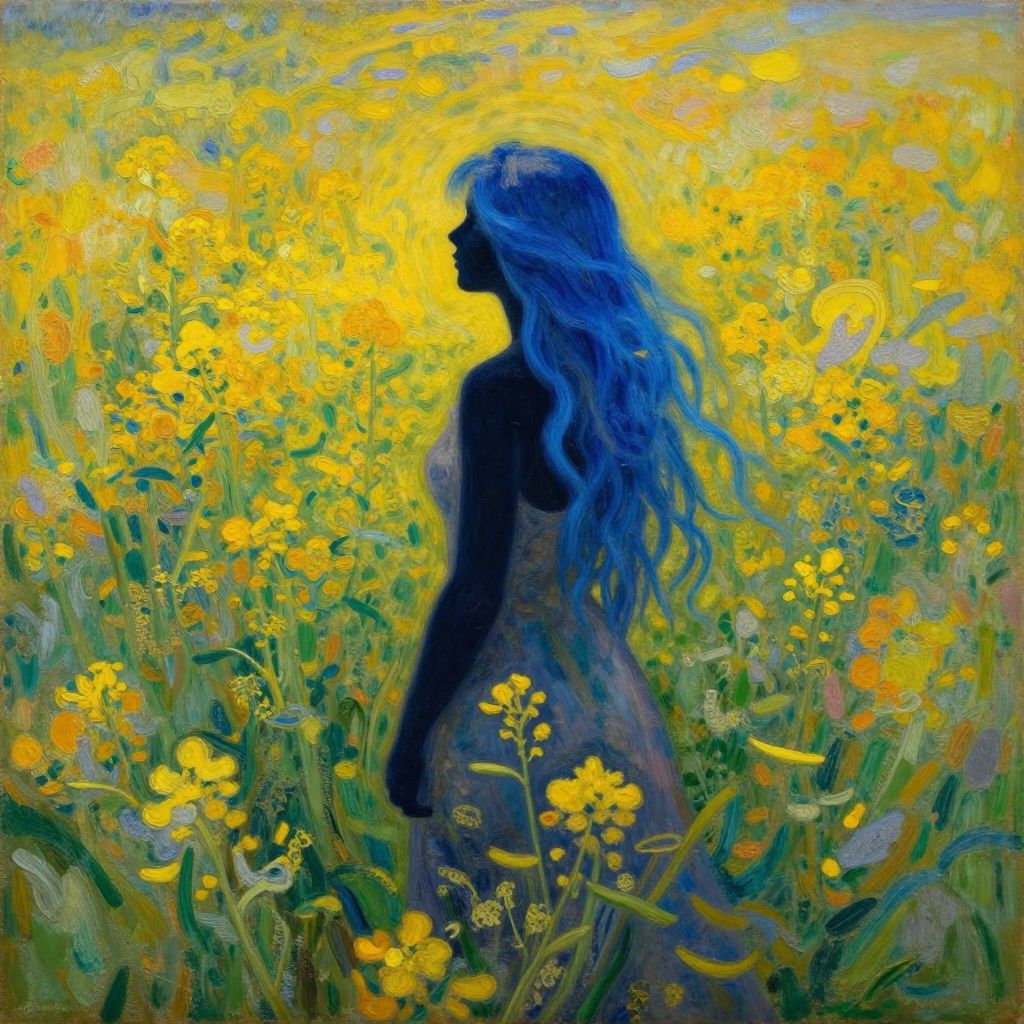 Craft an impressionistic landscape reminiscent of Hermes Monet's dreamy brushstrokes, depicting a young woman with vibrant turquoise hair standing at the edge of a vast golden field. The scene transitions from her close-up face to a panoramic view of the landscape as she gazes out over the horizon, seamlessly blending into the scenery with her flowing dress that echoes the movement of the tall grasses in the wind. This 'bug's-eye view' perspective captures the soft, hazy brushstrokes and color palette, evoking a serene and introspective mood while also conveying an enigmatic and otherworldly atmosphere. The gradual shift from detailed face to impressionistic landscape creates an emotional gradient that encourages viewers to embark on their own journey through the painting's captivating world.
