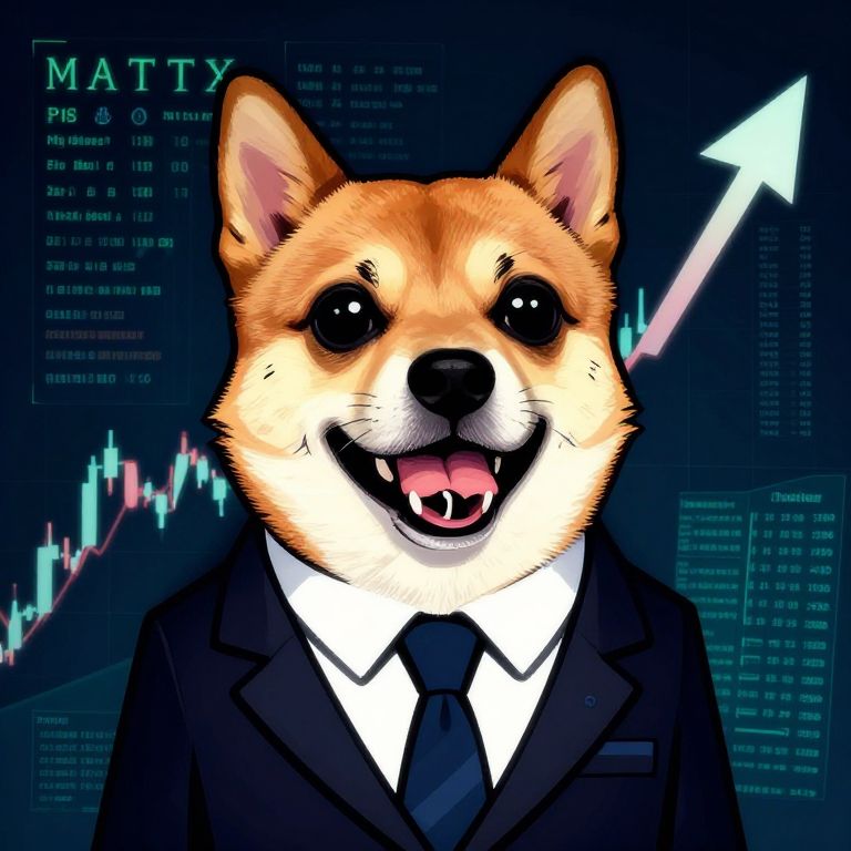 Digital illustration of a smiling Shiba Inu dog in a black suit and tie, with a rising arrow graph background. Text "MATTY"