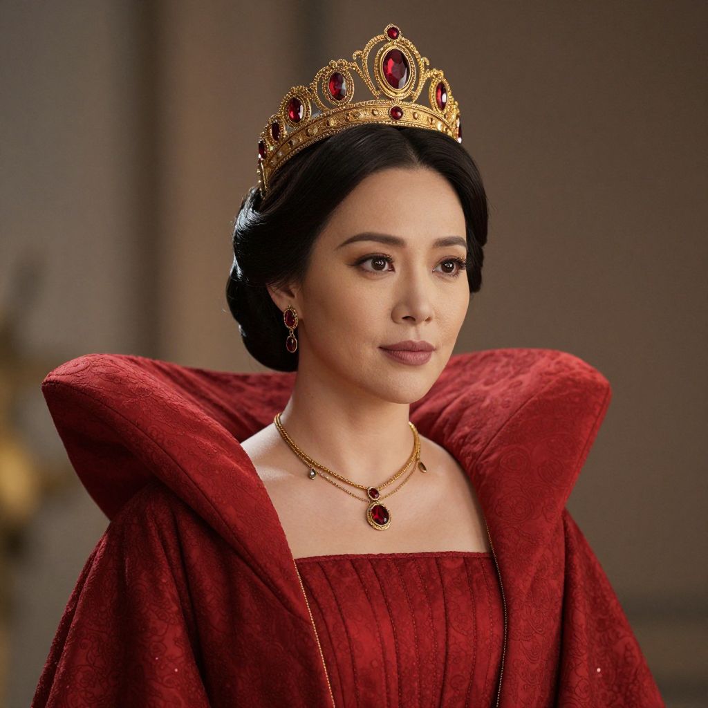 Queen Amidala Wardrobe, a close up of a woman in a red dress and a crown