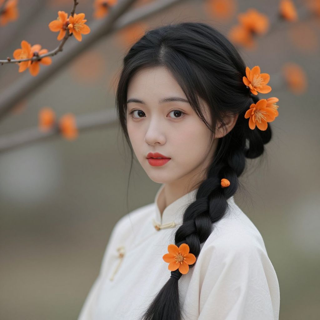 Orange blossom character, 1girl, solo, flower, looking at viewer, black hair, blurry, long hair, hair flower, hair ornament, braid, realistic, blurry background, chinese clothes, orange flower, asian, red lips, upper body, closed mouth