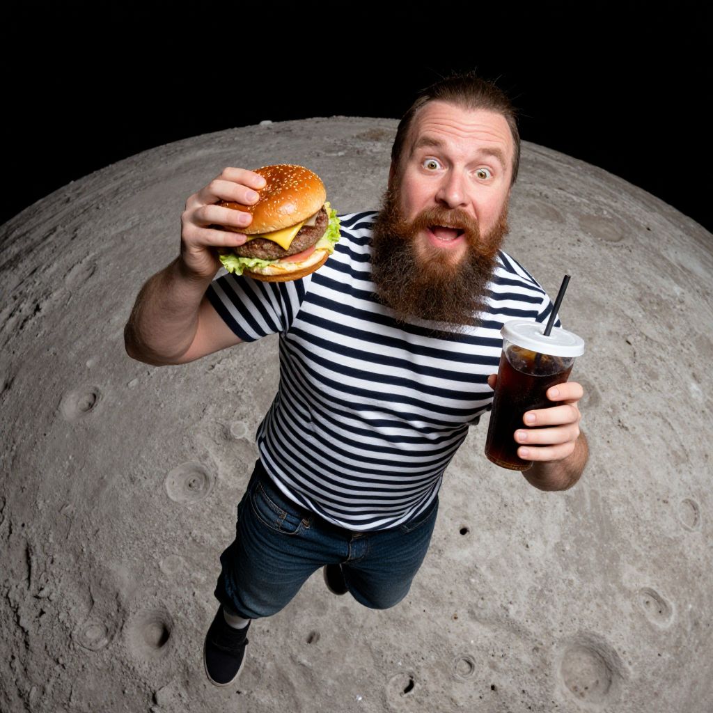 A man with a large beard and a striped shirt is floating on the moon, holding a burger and a drink with a straw.