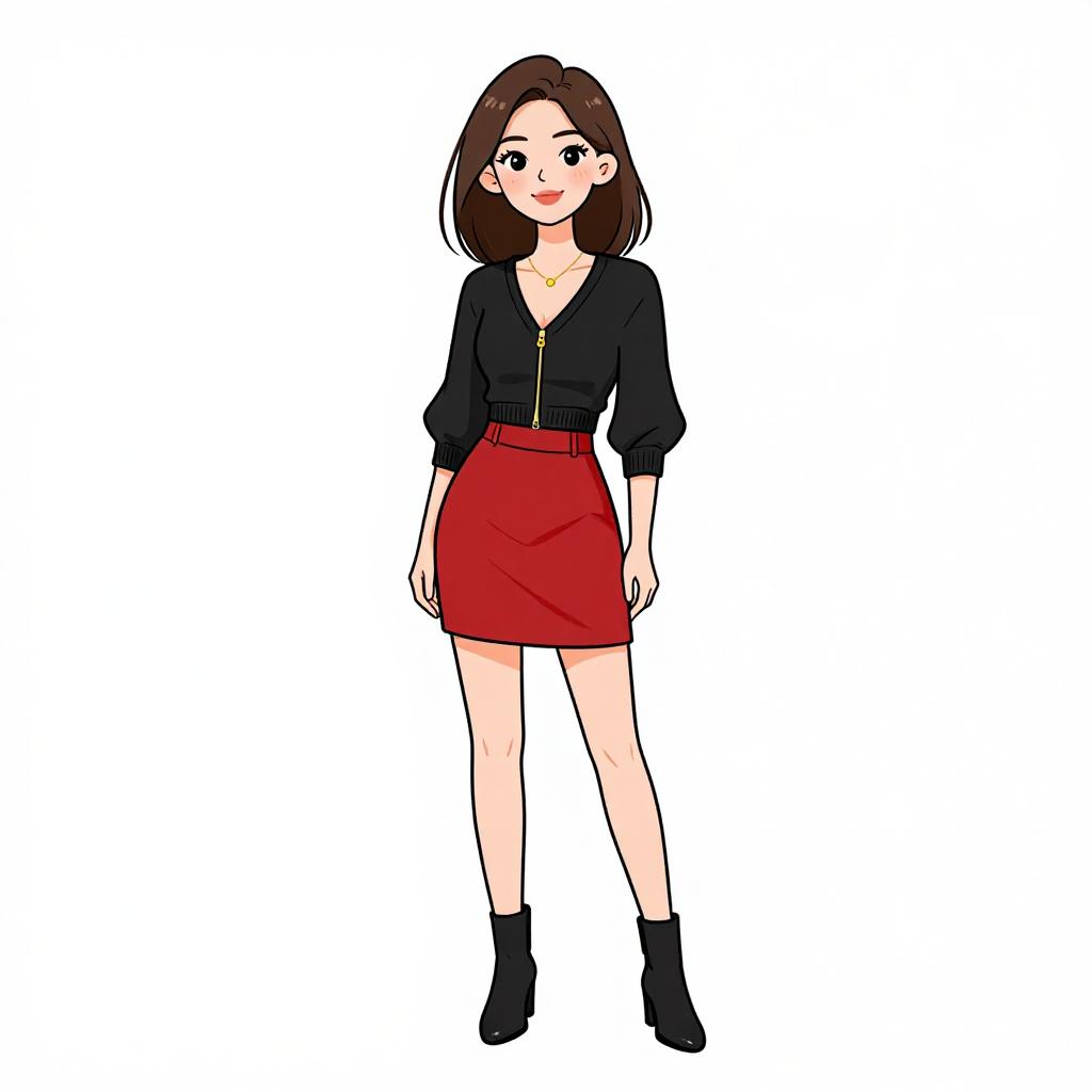 Woman with pretty face and pretty hair. smiling Woman, preppy chic, speckled maroon sweater, white turtleneck underneath, high-waisted metallic blue mini skirt, sheer black tights with polka dot detail, black ankle boots with low heel, simple black shoulder bag, straight hair, white studio background. --sref 1467