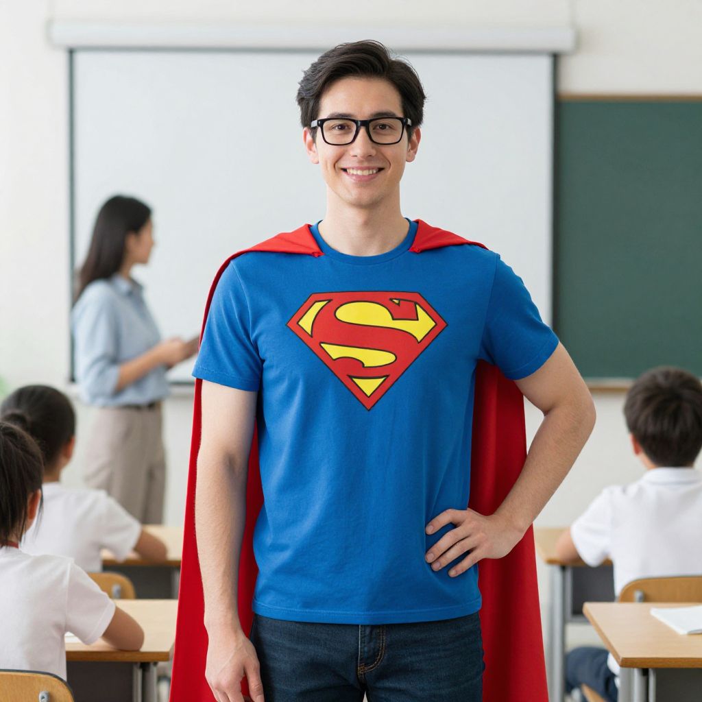 Photograph of a smiling Asian man with short black hair and glasses, wearing a blue Superman T-shirt with a red and yellow "S" logo, and a red cape. He stands in a classroom with a chalkboard in the background. Other students, mostly Asian, in white shirts are seated at desks. A woman with long black hair, dressed in a light blue shirt, stands at the back of the classroom, slightly out of focus. The classroom is brightly lit with natural light. The man's casual jeans and relaxed stance contrast with the superhero attire.