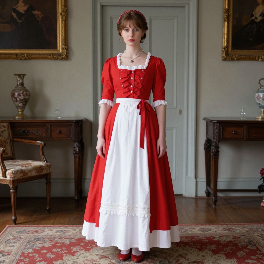 Old British Dress, woman in a red and white dress standing in a room