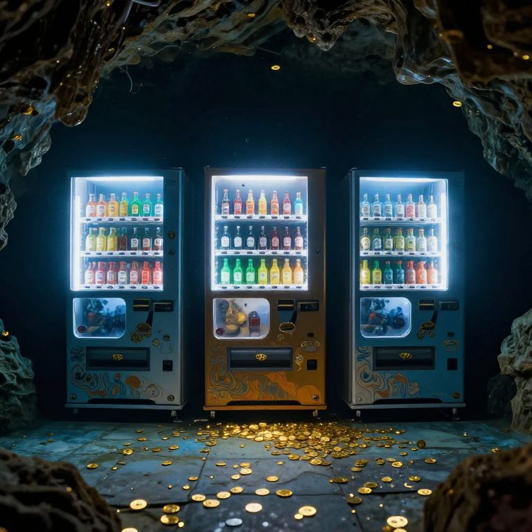 Photograph of a dimly lit cave with three brightly illuminated vending machines in the center. Each machine displays an array of colorful soda bottles, with blue, green, red, and yellow hues visible. The vending machines are surrounded by rough, rocky cave walls, with scattered golden coins covering the cave floor. The machines are positioned in a triangular formation, and their bright lights contrast sharply with the dark cave environment. The scene has a surreal, almost fantasy-like atmosphere, enhanced by the vivid colors of the sodas and the glinting coins.