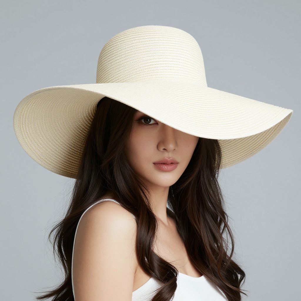 Photograph of an East Asian woman with pale skin and long, straight black hair, wearing a large, wide-brimmed, black woven sunhat that partially obscures her face. She has red lipstick and is dressed in a black, sleeveless, V-neck top. The background is a solid, light gray color, which contrasts with her dark hat and top, making her face and lips stand out. The hat's texture is visible, and her expression is neutral. The image focuses on her upper body and face, emphasizing her stylish, minimalist look.