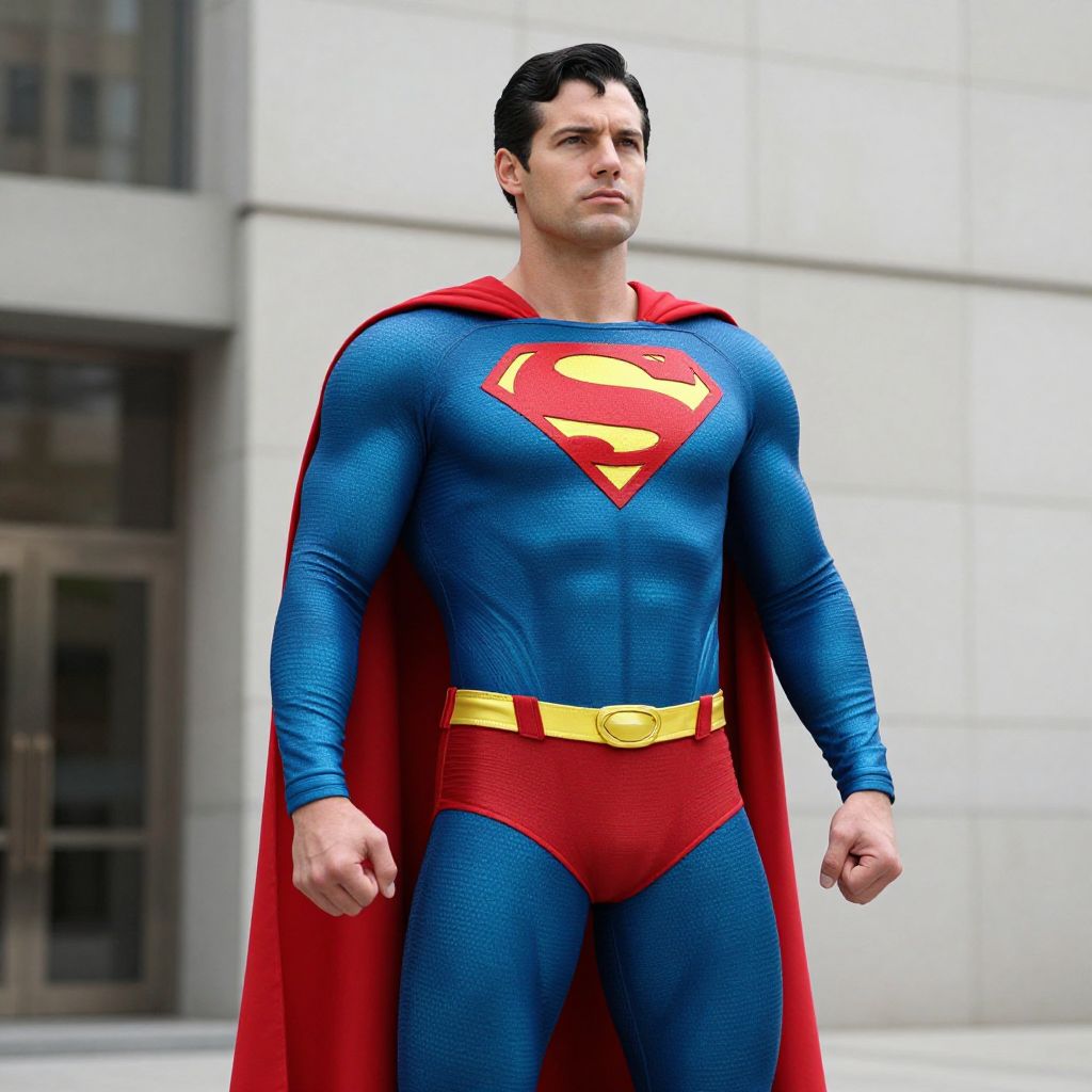 Superman Real Costume, superman is standing in front of a building with a red cape