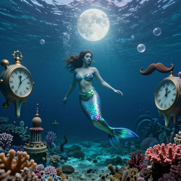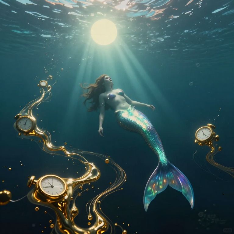In this surreal underwater dreamscape, an enormous tower protrudes from the ocean floor, its hands frozen at an enigmatic moment. The tranquil faces of smiling merpeople dance around the base of the timepiece, their flowing hair resembling seaweed in the ethereal blue glow that bathes the scene. A curious sea turtle approaches the submerged time capsule, its 'bug's-eye view' evoking a sense of wonder and introspection as it contemplates the passage of time within this enchanting, otherworldly realm.
