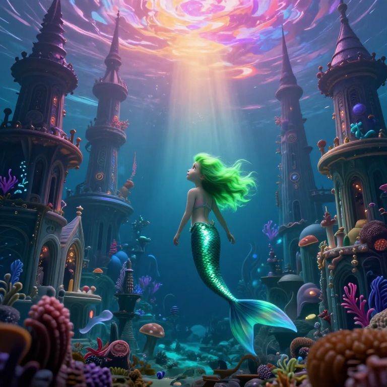 Underwater fantasy scene: mermaids, sea turtle, and clock hand with clock face, surrounded by colorful coral, fish, and bubbles, illuminated by