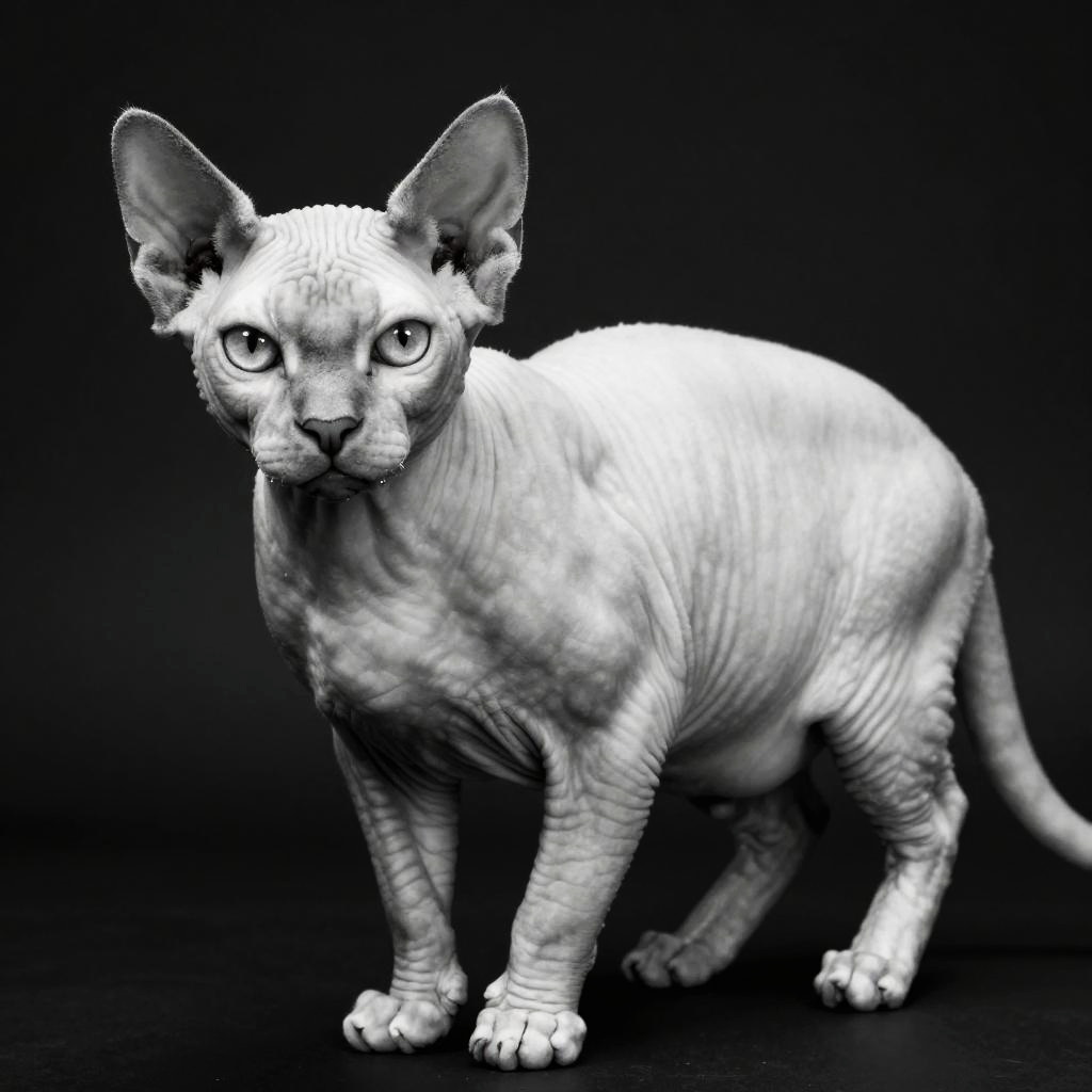By Helmut Newton, hyper realistic greyscale photo of a pure white sphynx cat, (monochrome, chiaroscuro, photorealistic, professional, masterful:1.4), hyper detailed, award winning, limited monochrome palette, extremely high contrast, ivory and black hue, (intricate details, masterpiece, best quality:1.4), dramatic cinematic lighting, wide angle panoramic view, simple black background, dynamic