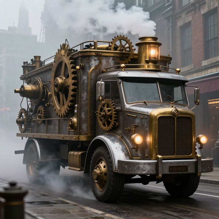 Steampunk truck traveling through a foggy Victorian cityscape, adorned with brass gears, glowing lanterns, and steam exhaust, detailed metallic textures and vintage machinery.
