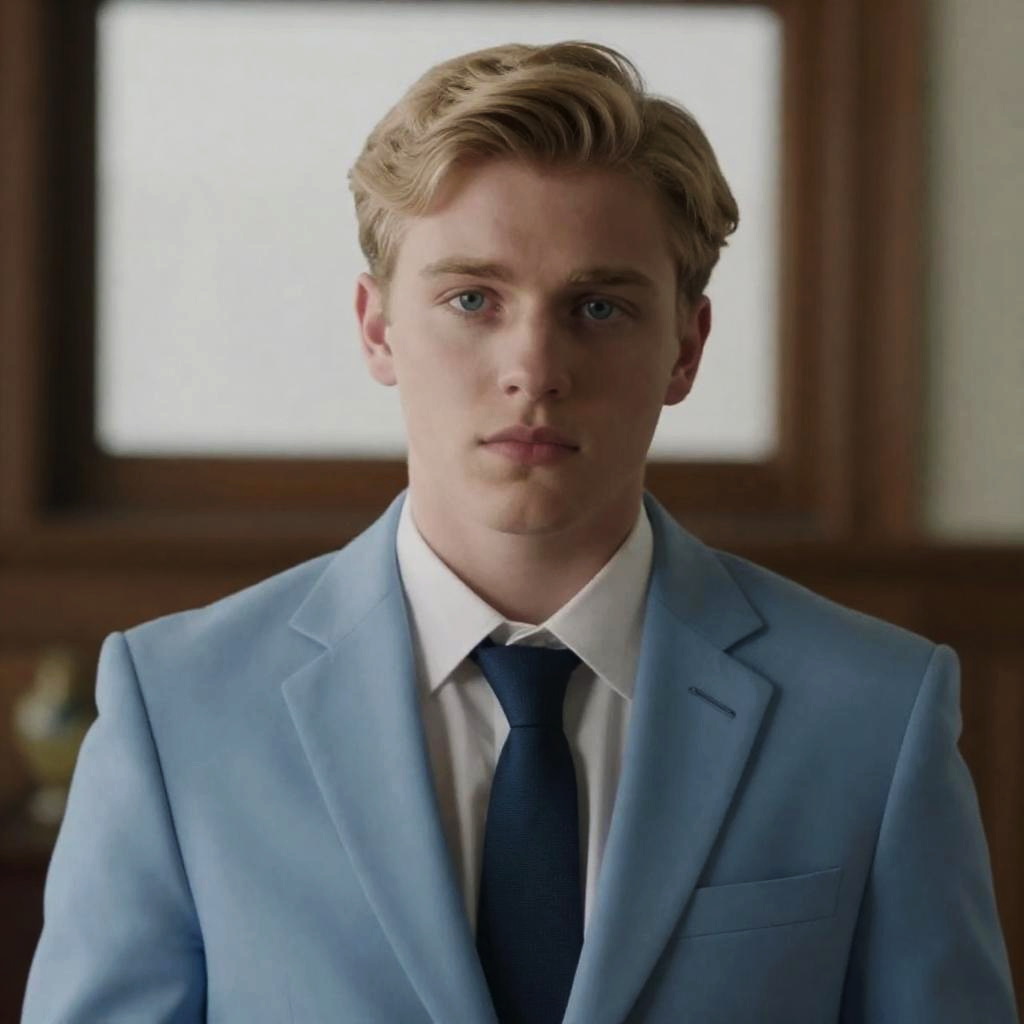 Photograph of a young man with short blond hair and blue eyes, wearing a light blue suit and tie, indoors. Background includes a blurred window and wooden furniture. Man's expression is neutral, slightly serious. Soft indoor lighting.