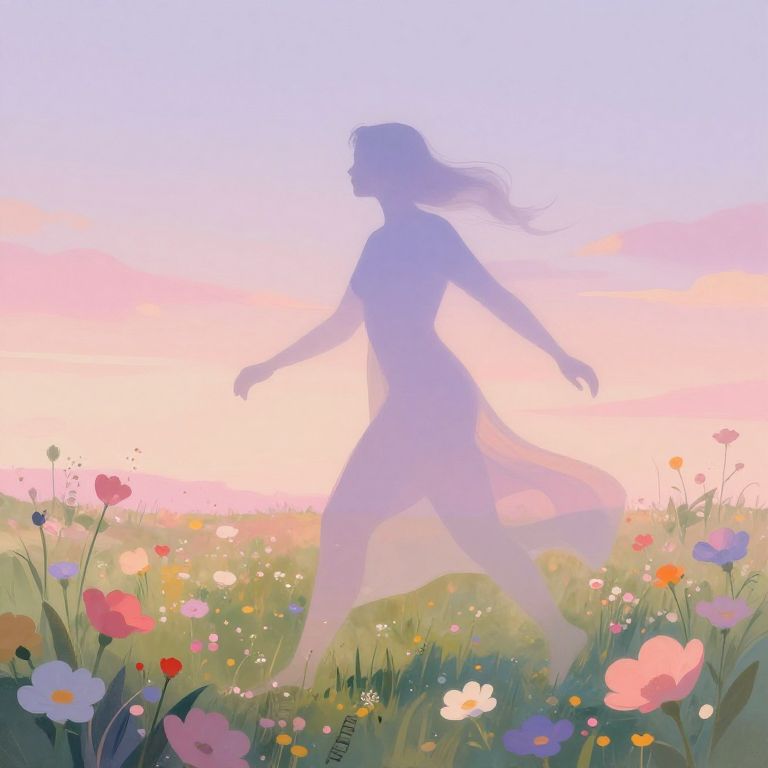Digital artwork of a silhouetted female figure running through a vibrant, colorful meadow at sunset. The woman's silhouette is soft and ethereal, with flowing hair, and she is dressed in a simple, form-fitting dress. The meadow is filled with a variety of colorful flowers, including pink, white, and purple blooms, with green grass in the foreground. The background features a gradient sky transitioning from pink to purple, adding a dreamy, serene atmosphere. The overall style is whimsical and romantic, with a focus on light, color, and movement.