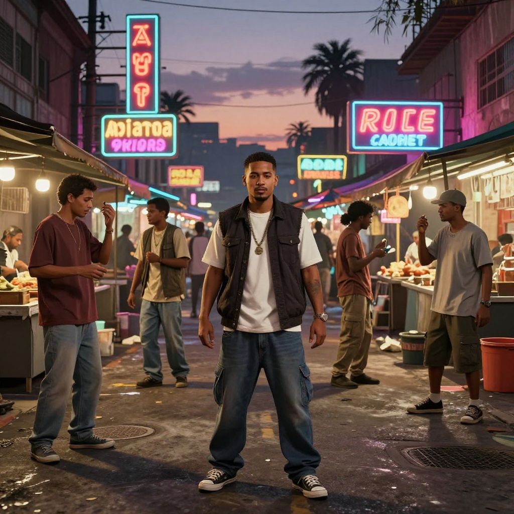 GTA filter on a street market scene bustling with characters, dynamic poses, colorful neon signs, detailed expressions, gritty textures and shadows, cinematic framing with a dusk sky background, vibrant but moody atmosphere, stylized realism.
