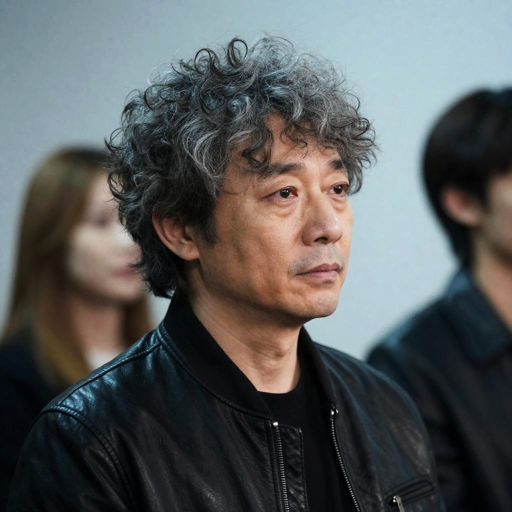 Photograph of a middle-aged man with light brown skin, black beanie, black glasses, and black jacket, facing another person with gray bob-cut hair in a blue shirt. Background is blurry with brown and beige tones. Man has focused expression. Two people.