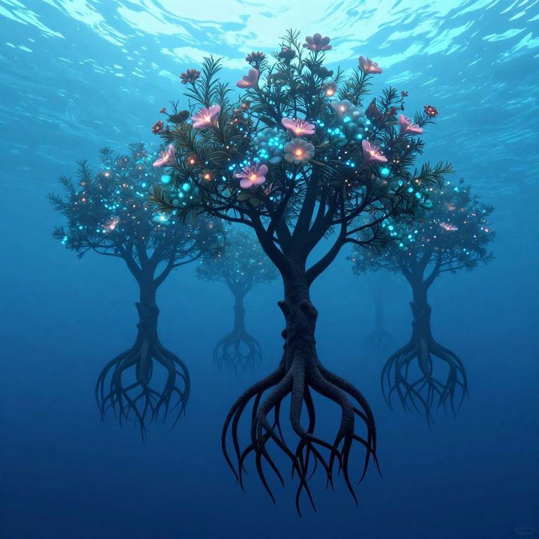 Digital art of underwater trees with glowing pink and blue flowers, illuminated by sunlight from above, with visible roots.