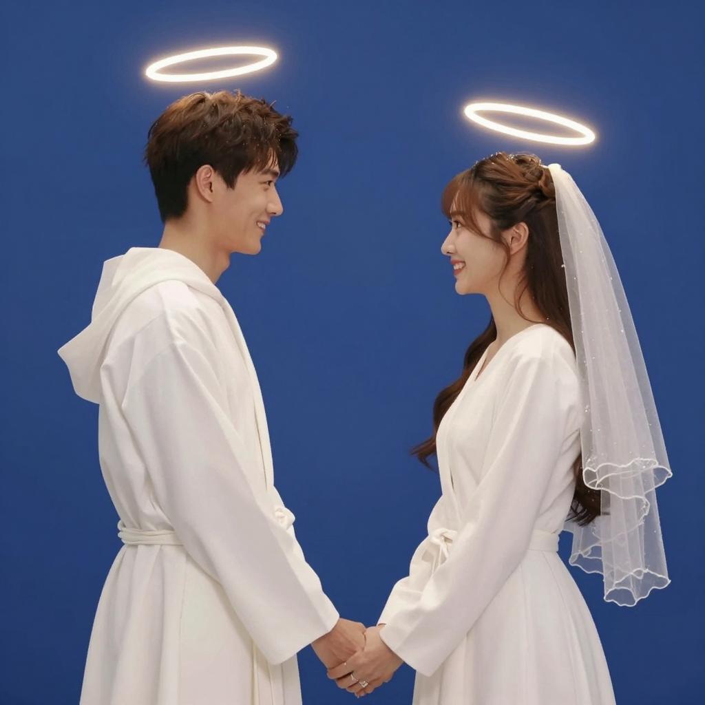 Two people in white robes holding hands against a blue background. Both have glowing halos above their heads. Man on left with short brown hair, woman on right with long brown hair and veil. They are facing each other, smiling.