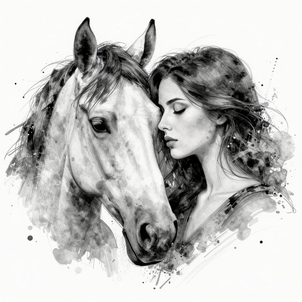 The image presents a striking abstract portrait of a woman and a horse, rendered in a monochromatic palette. The woman's face is partially obscured by the horse's head, creating a sense of intimacy and connection between the two subjects. The horse's mane and the woman's hair are depicted with dynamic, splattered ink effects, adding a sense of movement and fluidity to the composition. The horse's head is positioned to the left, while the woman's face is on the right, with their forms blending seamlessly into each other. The overall composition is balanced, with the horse's head and the woman's face aligned in a way that draws the viewer's eye across the image. The use of line art and ink splatters creates a textured, almost painterly effect, enhancing the emotional depth and visual interest of the piece.