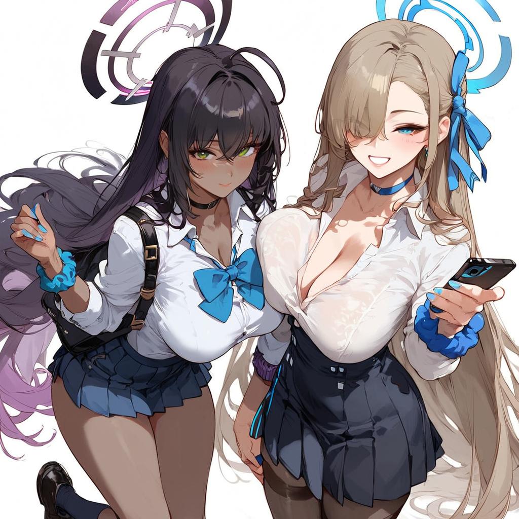 Score_9, score_8_up, score_7_up, score_6_up, score_5_up, score_4_up, source_anime, rating_safe, (mature female:1.2), (cutesexyrobutts:0.75), karin \(blue archive\), asuna \(blue archive\), multiple girls, 2girls, skirt, dark skin, halo, dark-skinned female, long hair, school uniform, blue eyes, hair over one eye, breasts, yellow eyes, black hair, shirt, socks, very long hair, smile, scrunchie, large breasts, pleated skirt, full body, white shirt, bag, looking at viewer, phone, school bag, light brown hair, grin, hand in pocket, purple hair, pantyhose, nail polish, wrist scrunchie, bangs, black footwear, black skirt, blush, white background, kneehighs, long sleeves, collared shirt, blue nails, blonde hair, holding, choker, bow, cellphone, sweater, hair ribbon, cleavage, simple background, one eye covered, ribbon, bowtie, shoes