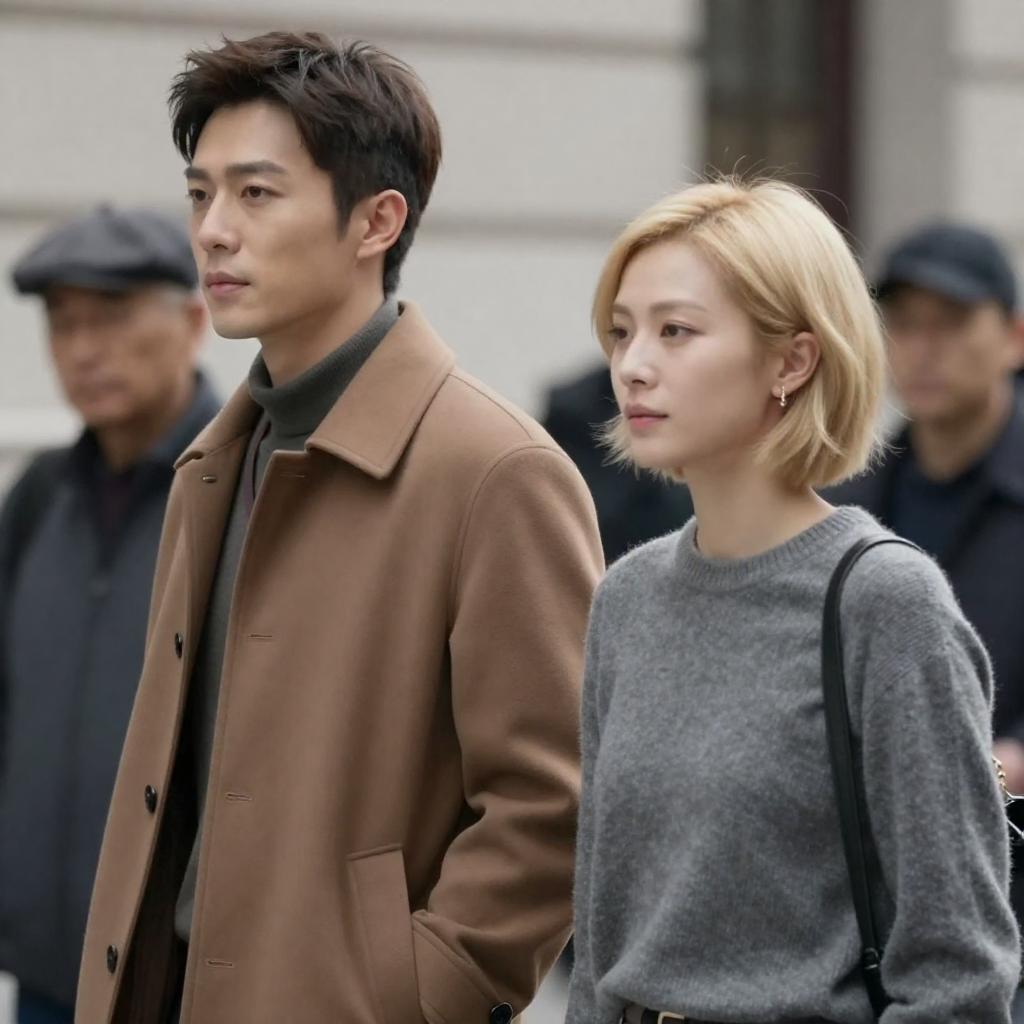 Photograph of a blonde woman with short hair, smiling, wearing a brown dress with a belt, standing next to a dark-haired man in a navy polo shirt. Urban street background, blurred pedestrians, trees. Woman's right hand in her dress pocket. Man looking slightly at her. Casual, friendly atmosphere.