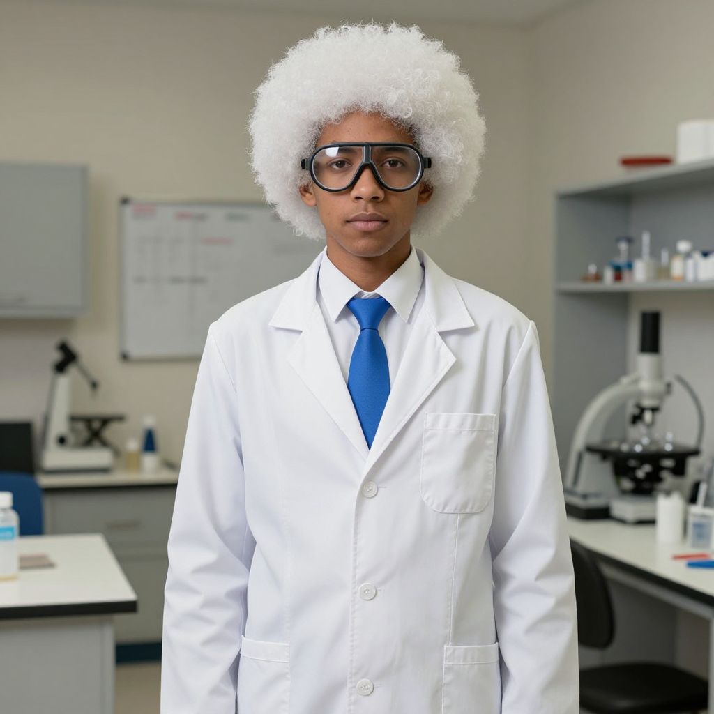 Photograph of a young Black man with a large, curly white Afro, wearing large black-rimmed glasses and a white lab coat with a blue tie. He stands in a brightly lit laboratory, featuring a whiteboard, microscope, and various scientific equipment on the shelves in the background. The lab has a clean, clinical appearance with white and grey walls, and a desk with a blue object on the left side. The man's expression is neutral, and he is centrally framed in the image.