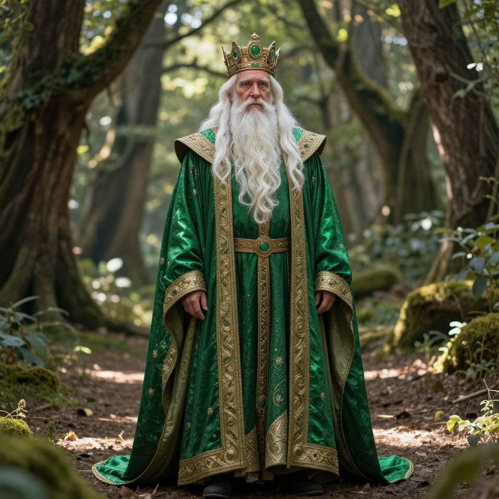A distinguished man with a full, meticulously groomed beard, a glowing golden crown resting upon his head, and a detailed medieval costume consisting of a rich red and silver doublet, a flowing velvet cloak in deep burgundy with silver embroidery, and a tall, pointed hat adorned with ornate metal trim, stands solemnly in a sun-dappled forest clearing. The golden light filters through the canopy of ancient trees, casting intricate patterns on the moss-covered ground. In the distance, weathered stone ruins rise from the forest floor, their crumbling arches and carved facades hinting at forgotten lore. The atmosphere is regal, mysterious, and timeless—evoking a sense of ancient power and quiet wisdom. The man's presence commands attention, radiating authority and enigmatic charm.