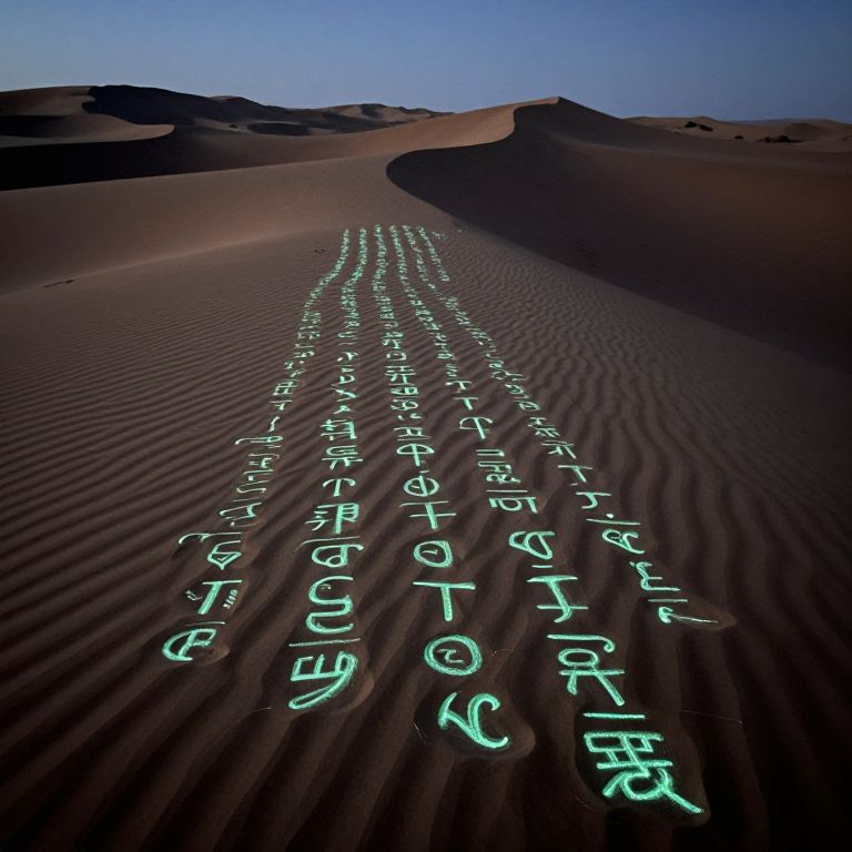 Photograph of a vast, undulating desert landscape under a clear blue sky. The sand is rippled with fine textures, and glowing, neon-green hieroglyphs stretch diagonally from the bottom left to the top right of the image, creating a striking contrast against the dark brown sand. The hieroglyphs appear to be illuminated from within, casting subtle shadows on the sand. In the background, the desert extends to rolling dunes that are partially shadowed. The image evokes a sense of mystery and ancient mysticism, blending natural and mystical elements.