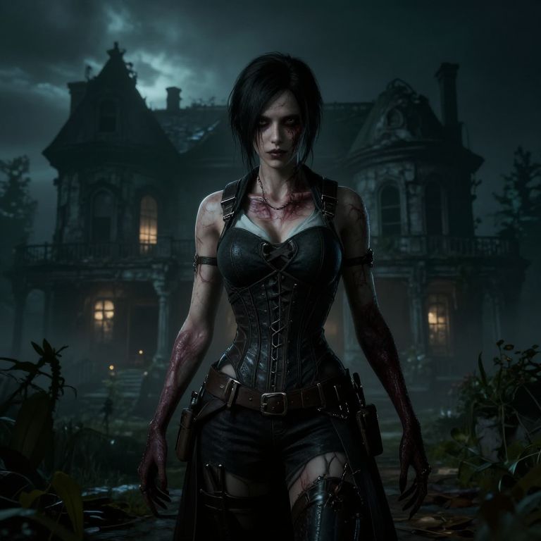 Photograph-style digital art depicting a dark, gothic scene at night. A pale, slender woman with short, black hair and blood-stained skin stands in the foreground. She wears a black leather corset, matching arm bracers, and torn black pants with leather straps. Her expression is intense, with blood visible on her neck and arms. Behind her, a dilapidated, gothic mansion with tall, arched windows emits a dim, eerie light. The sky is overcast, adding to the ominous atmosphere. Shadows and dark greens dominate the foreground, with plants and debris surrounding the woman. The overall color palette is dark, with a focus on blues and blacks.