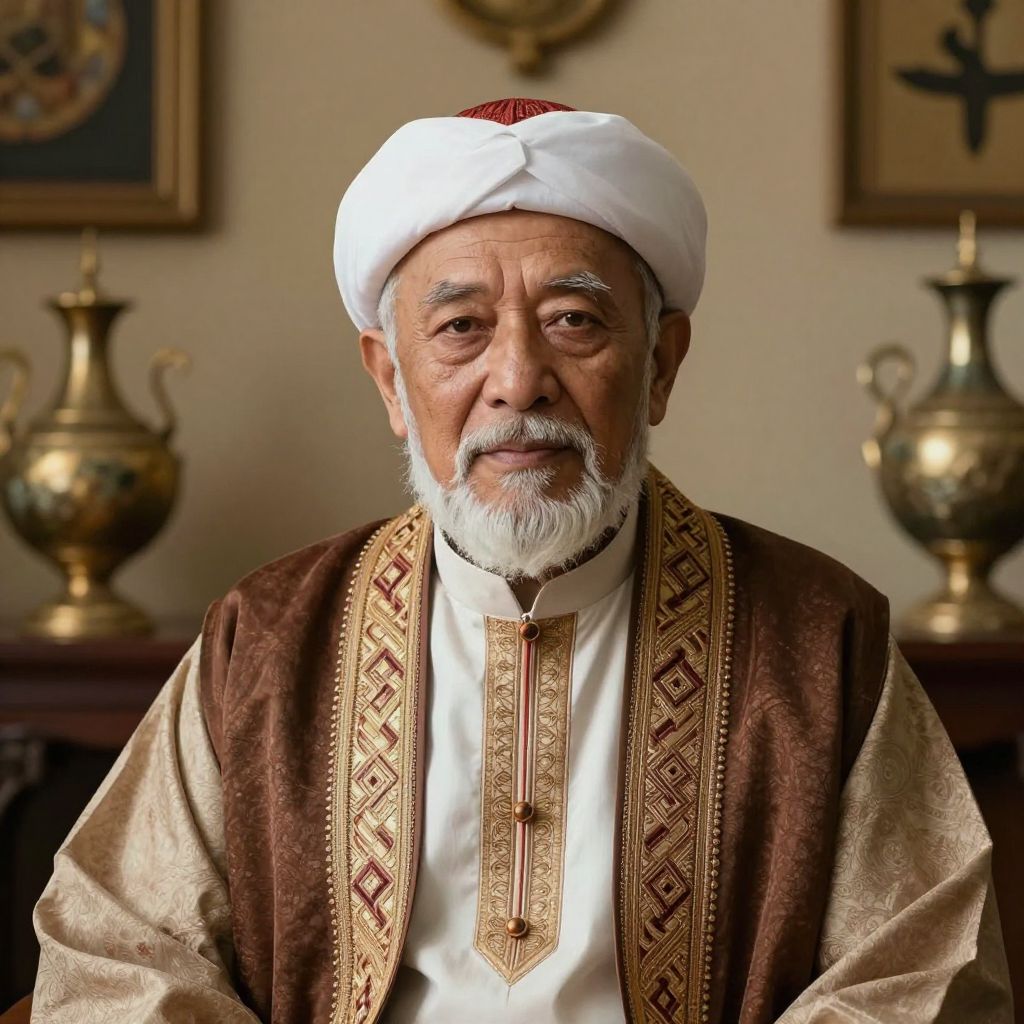 Photograph of an elderly Middle Eastern man with a white beard, wearing a white turban and ornate brown vest over a white shirt, in a