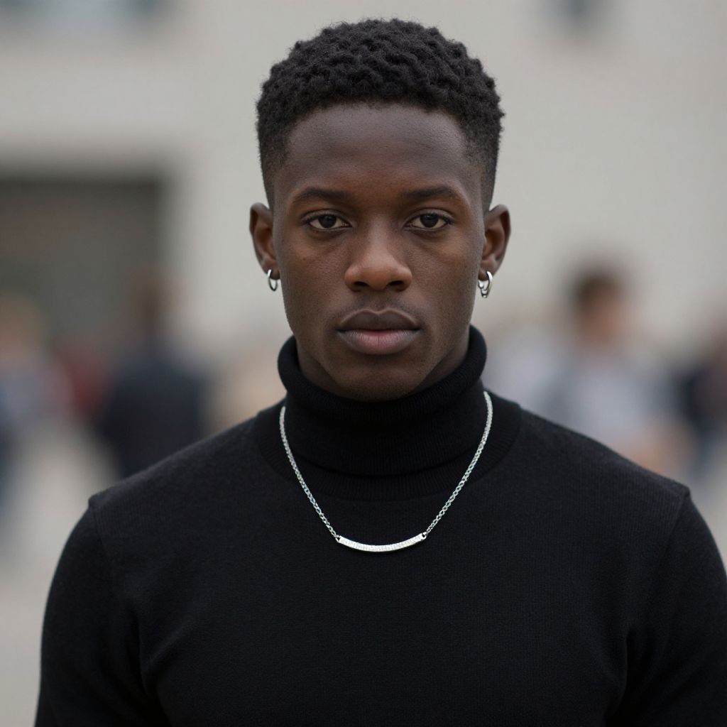 Male black cosplay, jewelry, 1boy, male focus, solo, black hair, necklace, earrings, realistic, blurry, turtleneck, looking at viewer, upper body, blurry background