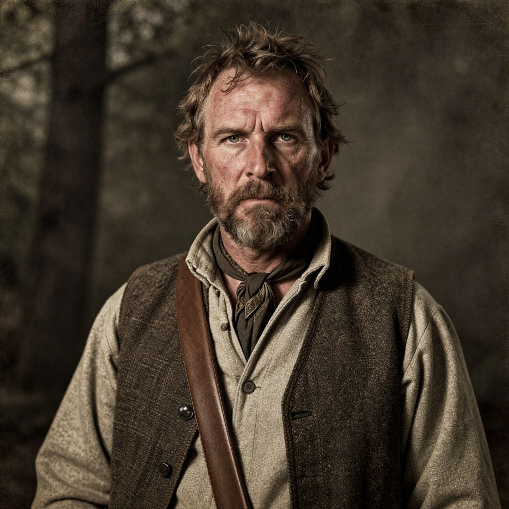 Photograph of a rugged, middle-aged white man with unkempt brown hair and a beard, wearing a beige shirt, brown vest, and leather strap across his chest. His intense, weathered expression contrasts with the dark, blurry forest background. The image has a high-contrast, sepia-toned filter, giving it a vintage, dramatic effect. The man's rough texture and worn clothing suggest a life spent outdoors or in challenging conditions. The lighting emphasizes his facial features and the texture of his clothing, adding to the overall gritty, historical atmosphere of the portrait.