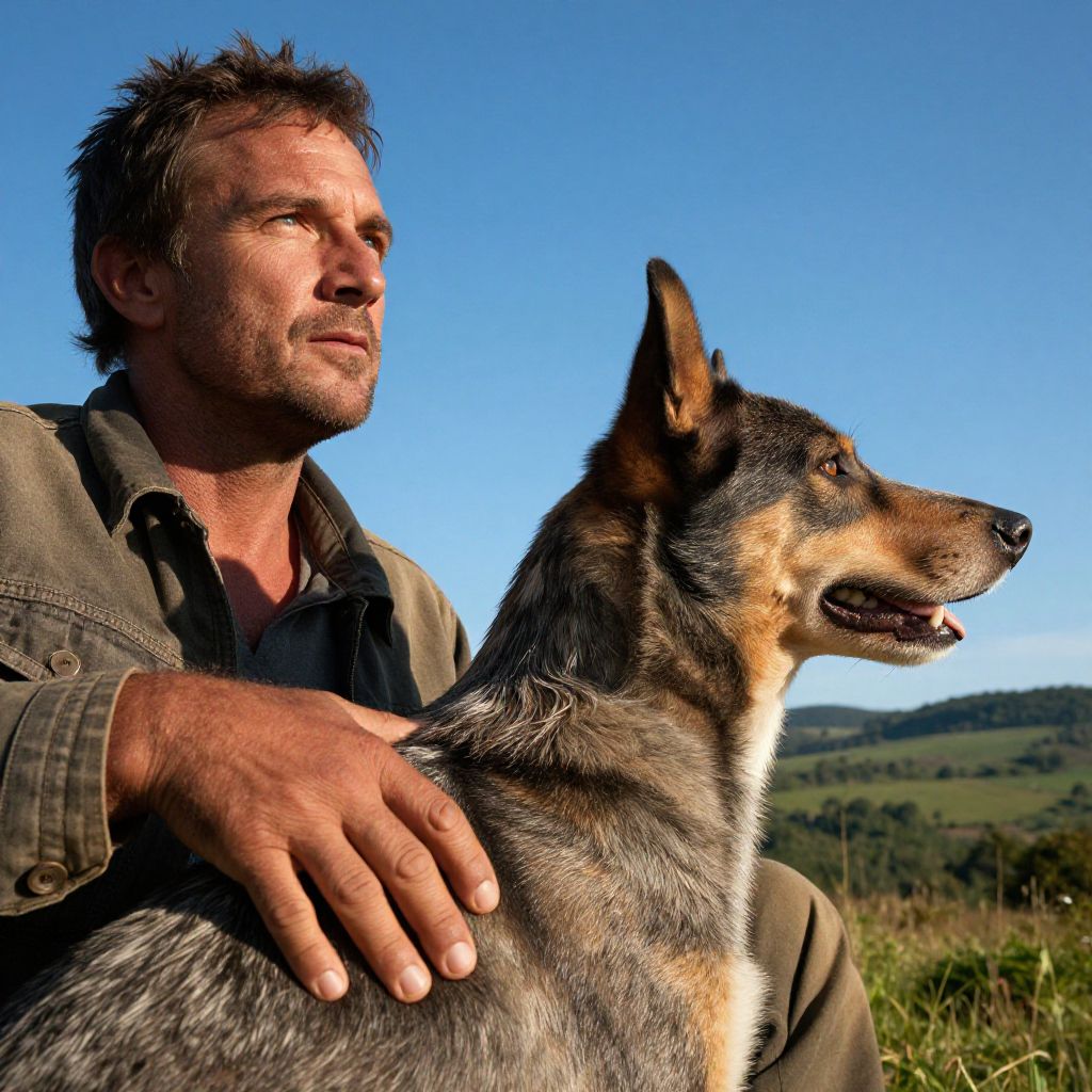 Intimate portrait of a rugged outdoorsman, hand resting on the back of his loyal blue heeler companion, both gazing upwards at an endless azure expanse, sunlight casting warm shadows across their faces, verdant landscape stretching out behind them, capturing the essence of their unbreakable bond. Man has masculine face and piercing eyes