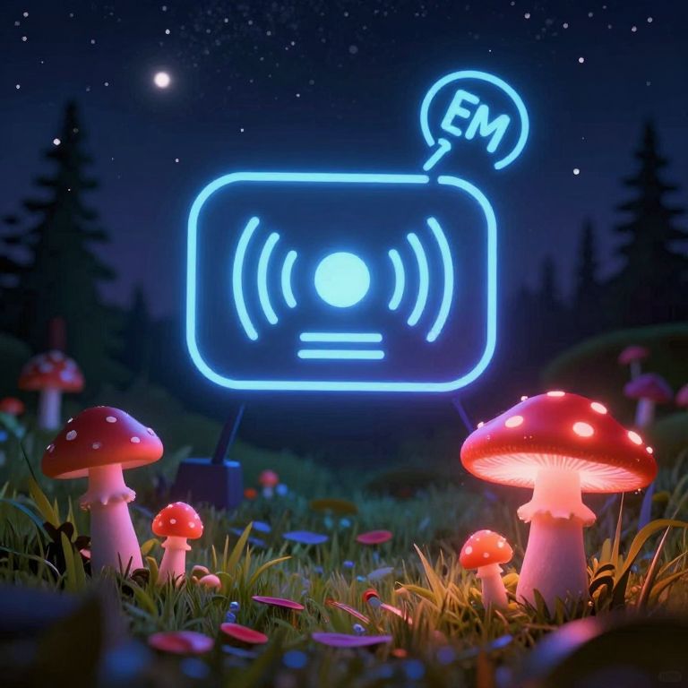 Neon "EM" sign with signal waves over glowing red mushrooms in a starry night forest, surrounded by grass and other mushrooms. Digital art style