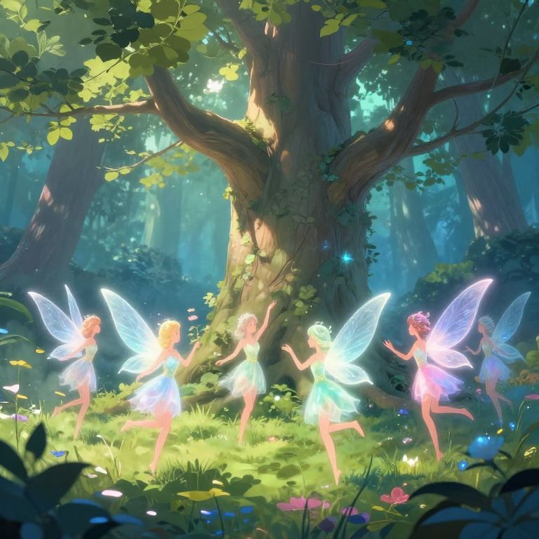 Digital art: Four glowing, fairy-like creatures with translucent wings dance under a sunlit, enchanted forest tree, surrounded by lush greenery and colorful flowers