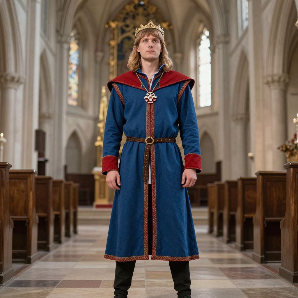 Photograph of a young Caucasian man with shoulder-length blonde hair, standing in a grand, Gothic-style cathedral. He wears a blue, medieval-style tunic with red trim, a black belt, and black pants. A gold crown rests on his head, and a silver necklace with a detailed pendant hangs around his neck. The cathedral features high, arched ceilings, stained glass windows, and wooden pews lined up on either side. The stone floor is tiled in a checkerboard pattern, and a golden altar is visible in the background. The man stands centered, looking directly at the camera with a neutral expression.