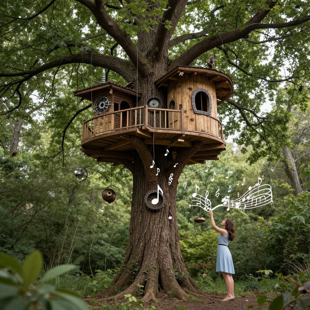 A colossal tree hosts a whimsical treehouse adorned with mechanical accents and suspended by cables, while floating musical notes cascade toward a woman below, weaving a surreal tapestry of nature and imagination.