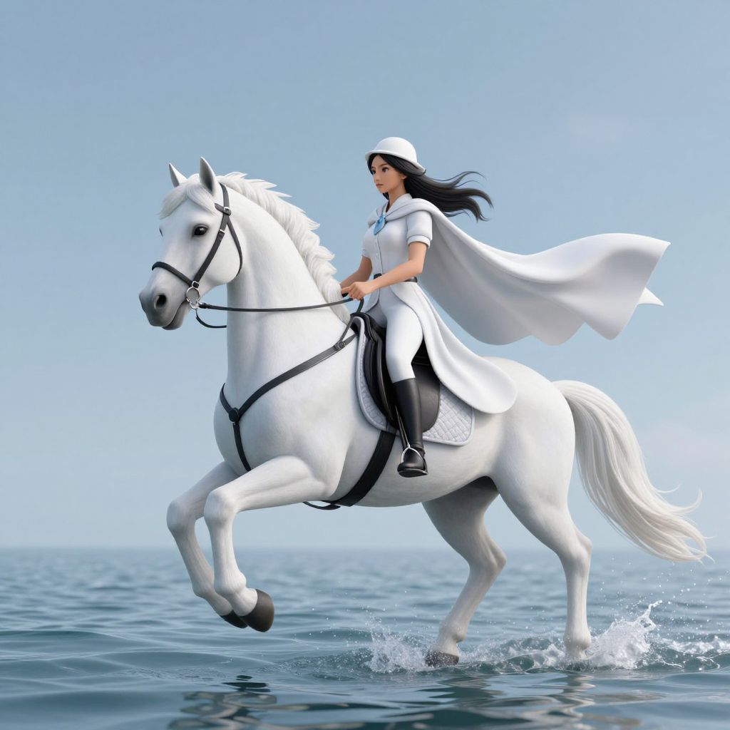 A serene 3D-rendered scene depicts a woman riding a majestic white horse through calm waters, her flowing cape evoking a sense of ethereal freedom, reminiscent of a fantasy academy where students learn to harness the winds on airborne steeds.