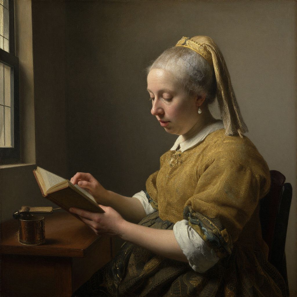 Baroque-style photograph of a pale-skinned woman with gray hair, wearing a brown dress and white cuffs, reading by dim light.