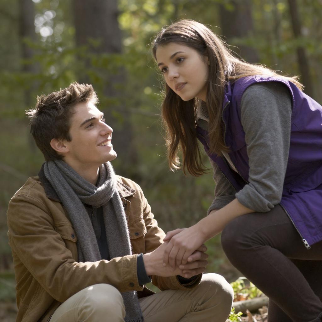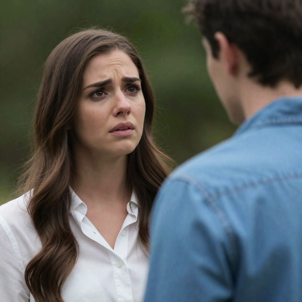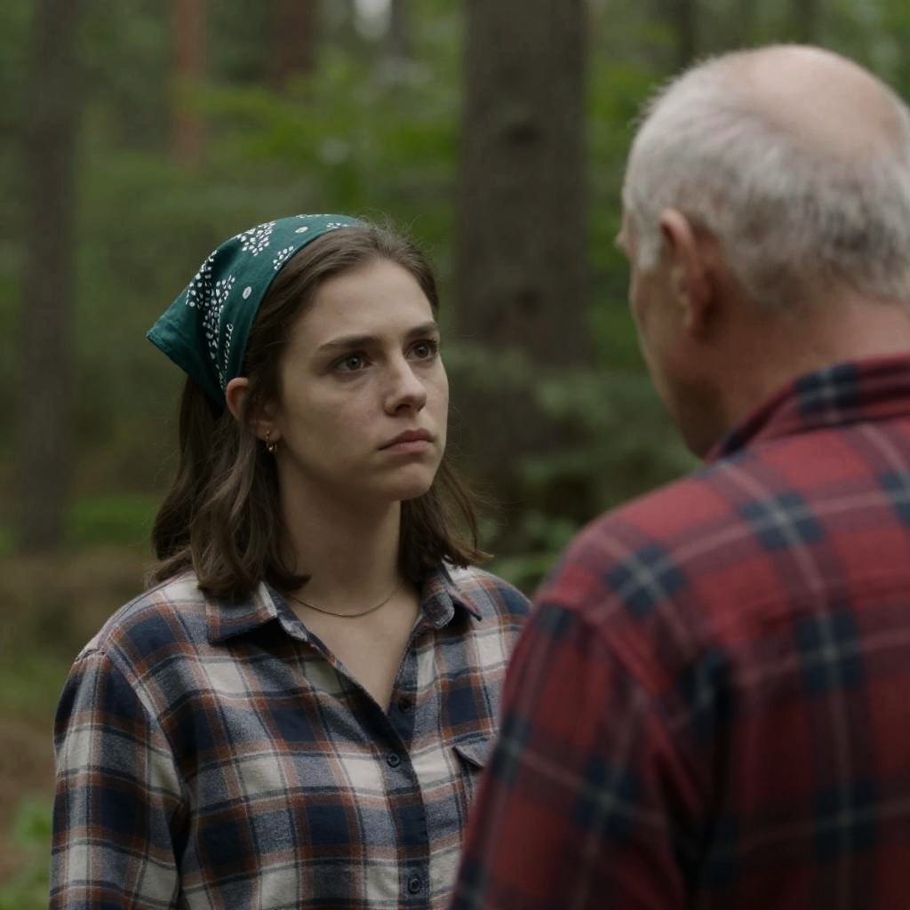 Photograph of a woman with long brown hair, wearing a black headband and purple jacket, standing beside a tree. A man with short brown hair, in a red jacket, stands in front of her, facing away. Both in a forest with sunlight filtering through trees. Woman looks intently at man. Background includes blurred green grass and tree trunks.