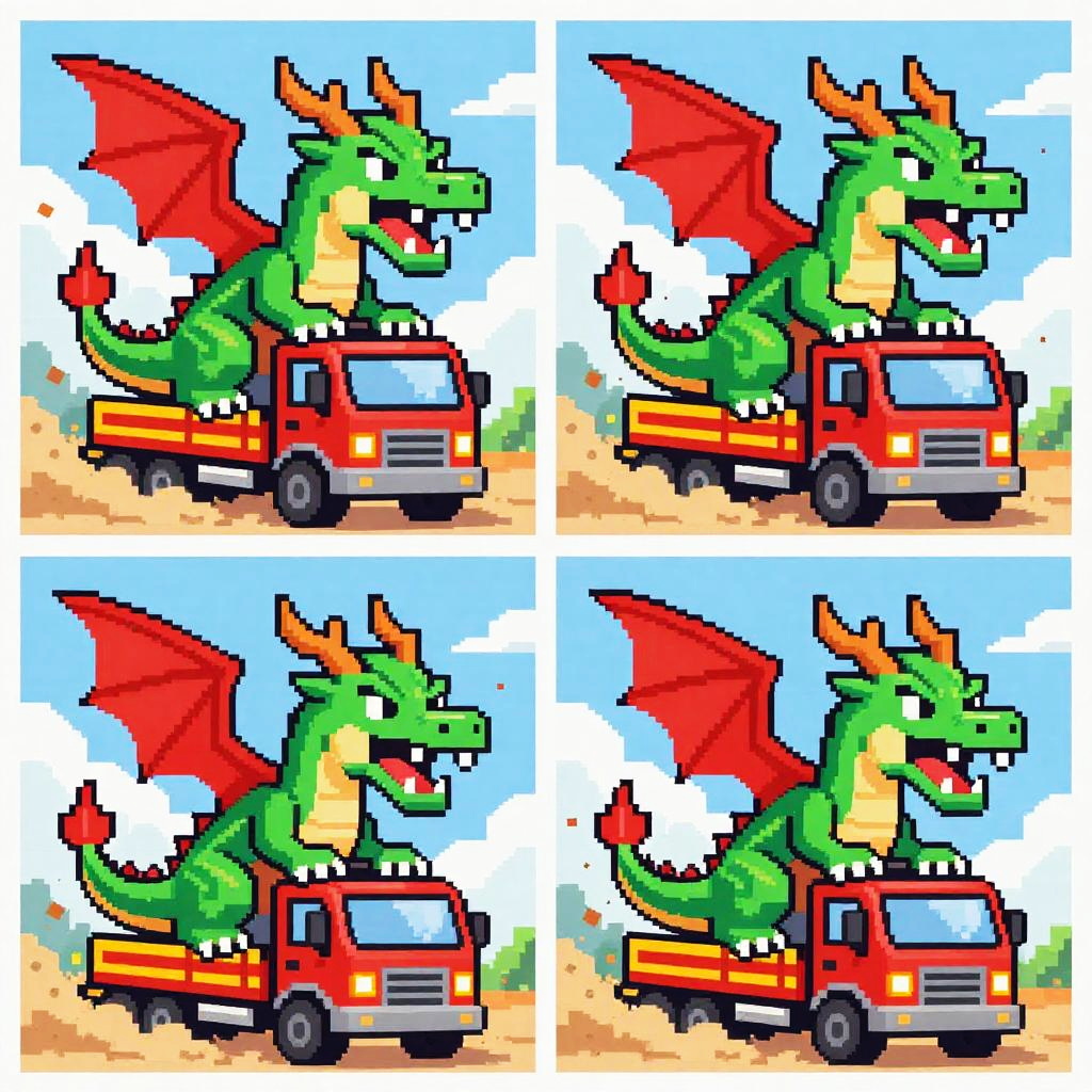 This pixel art collage features four colorful, dynamic scenes of a large, green, red-winged dragon riding on top of a red and yellow truck. The dragon looks fierce, with a wide-open mouth and sharp teeth. Each scene shows the truck crashing through a dusty, cloud-filled sky, with debris flying around. The art style is retro, with vibrant, blocky pixels, giving it a nostalgic, 8-bit video game feel.
