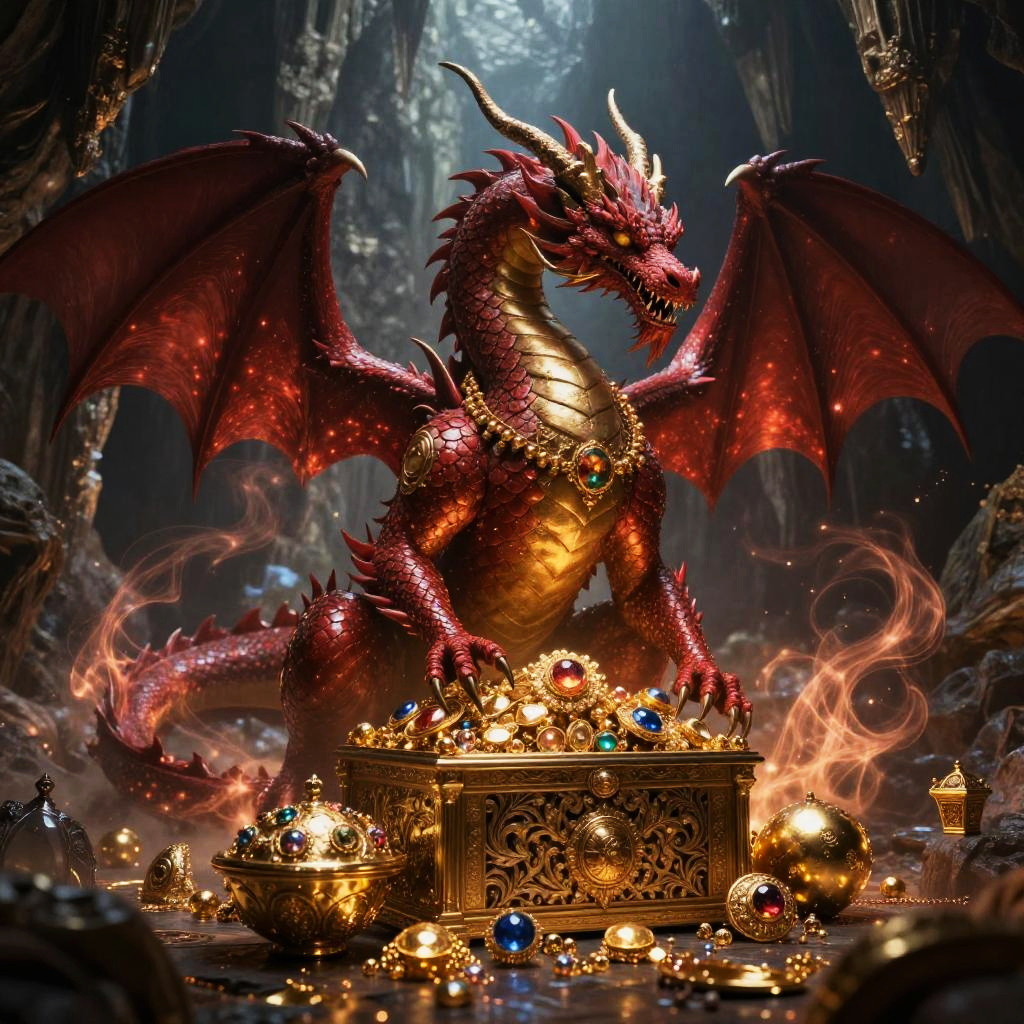 Mystical Red Dragon Guarding Treasure