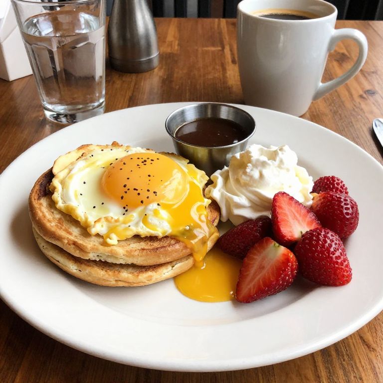 Photograph of a breakfast plate on a wooden table. The plate holds two golden-brown pancakes topped with a sunny-side-up egg, speckled with black pepper, and a dollop of fluffy white whipped cream. To the right are three fresh, red strawberries. A small metal cup of syrup is positioned beside the whipped cream. In the background, a white coffee mug and a clear glass of water are visible. The setting has a cozy, rustic atmosphere.