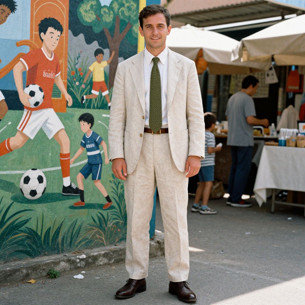 A man, light beige linen suit, off-white cotton dress shirt, olive green knit tie, dark brown leather dress shoes, matching leather belt, vibrant street murals, bustling market stalls, children playing soccer, medium format film, confident smile. Man has masculine face and piercing eyes
