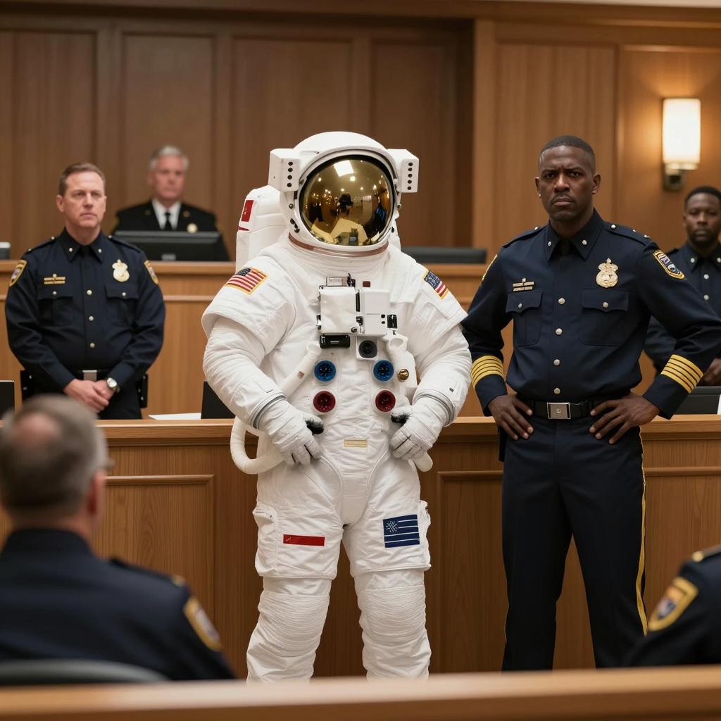 A serious-looking police officer in a dark uniform with badge stands next to a man in a gray suit with a striped tie and mustache in an office setting. The man has his arm around the officer's shoulder. An American flag is visible on the left, with office shelves and multiple people blurred in the background.