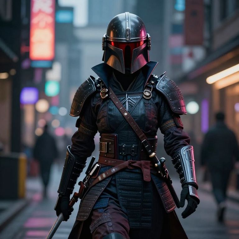 Cyberpunk Samurai Assassin with Mandalorian Helmet