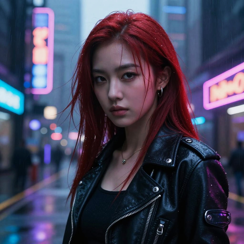 Asian girl with red hair in a futuristic cyberpunk cityscape, neon signs glowing in the rain-soaked streets, sleek leather jacket with metallic accessories, intense gaze, detailed face and hair strands illuminated by vibrant blue and purple lights, dramatic and dynamic scene